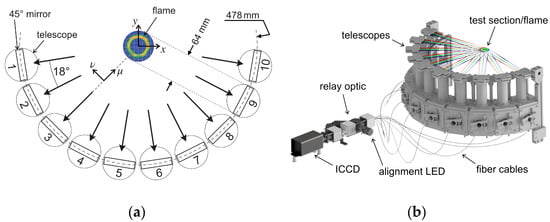 In the following, the definition of the coordinate systems was used as depicted in Figure 1 and Figure 2a: The coordinate system was centered in the middle of the flame or the measurement region, with the z-axis oriented perpendicular to the horizontal measurement plane. The acute angle between the x-axis and the projection directions of telescopes 1 and 10 was 9°. The -axis lay in the middle between projection directions 5 and 6. In addition, a local coordinate system was used for the telescopes, in which the μ-axis lay in the projection direction (line-of-sight) and the v-axis was perpendicular to the μ- and z-axes.