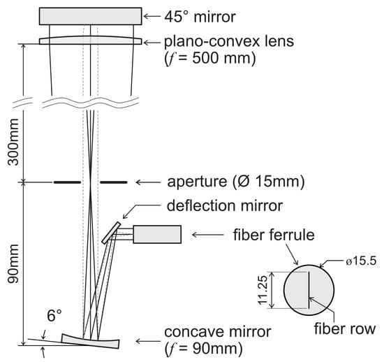 In our previous single-wavelength setup (POET) [20,21], the telescopes used a Kepler design with two plano-convex quartz glass lenses (f = 75 mm and 500 mm) and an iris aperture (ø15 mm) in the focal plane of both lenses to the detection to a small solid angle. However, especially the small short focal length lens caused strong chromatic aberrations in multi-wavelength operation. As a result, the OH* (310 nm) and CH* (430 nm) focal planes were displaced by ~120 mm relative to each other in the projection direction (line-of-sight), resulting in unacceptably different optical resolutions (in-plane and out-of-plane, see below) of both wavelengths. In the current setup (Figure 3), chromatic aberrations were minimized by using a spherical concave mirror instead of the short focal length lens. In order to minimize geometric aberrations, the concave mirror was inclined only by 6° with respect to the optical axis of the large, long focal length lens, which resembled a variant of the Herschelian reflector [61]. A small deflecting mirror then directed the light onto the fiber ferrule and the row of optical fibers. Using the clear aperture of the top lens ( mm) and its distance to the burner matrix (f = 478 mm), the -number of the telescope was calculated to be f# = f/D ≈ 7.2.