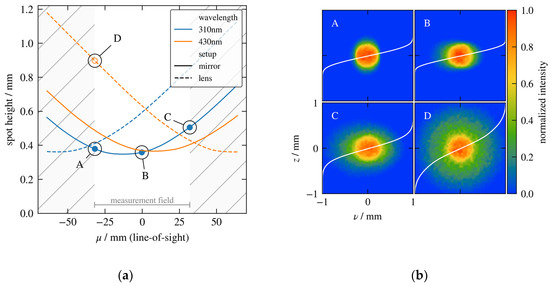 (a) Variation of the out-of-plane resolution (spot height) over the measurement field (line-of-sight direction) at 310 and 430 nm for a telescope with two lenses (dashed lines) or with a lens and tilted spherical concave mirror (solid lines). (b) Intensity distributions of the imaged spots and normal to the line-of-sight direction at selected positions A, B, C, and D. The white lines are cumulative probability density curves along the -axis. See the text for the definition of the coordinate systems.