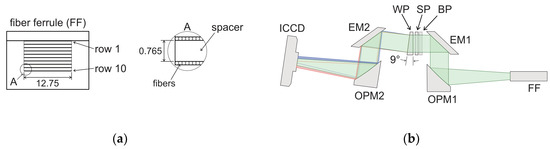 (a) Arrangement of stacked fiber rows; (b) optical layout of the relay optic between the fiber output and the image intensified charged coupled device (ICCD) camera. The signal of each individual optical fiber was spatially separated into its wavelengths by a prism and imaged onto the camera. (FF: fiber ferrule, OPM: off-axis parabolic mirror, EM: flat-elliptical mirror, BP: band-pass filter (optional), SP: short-pass filter, WP: wedged prism).