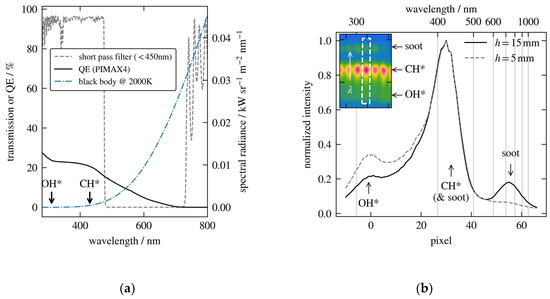 The spacer between the rows (Figure 5a) ensures that a broad spectral range of 300 to 800 nm could be detected without appreciable superposition or cross-talk of the signals of neighboring fiber rows. While the short-pass filter blocked all transmissions between 450 and 720 nm, it allowed light at even longer wavelengths to pass through again (Figure 6a). At the same time, the quantum efficiency of the image intensifier of the CCD camera at wavelengths greater than 700 nm was less than 1% and essentially zero above 800 nm. This combination ensured first that effectively no light with wavelengths larger than 800 nm was detected, thus avoiding crosstalk of the signals of adjacent rows due to spectral dispersion. Secondly, the emission of a sooting flame at wavelengths larger than 720 nm was intense enough to compensate for the low quantum efficiency of the photocathode. Therefore, soot signals between 720 and 800 nm could be detected, well separated from the emissions at 310 nm (OH*) and 430 nm (CH*). For comparison, Figure 6a also shows the black body spectrum at a soot temperature of 2000 K. At 750 nm the soot radiation was already about four orders-of-magnitude more intense than at 310 nm. As a consequence, we did not observe any soot radiation at 310 nm (OH*) but soot emissions at 430 nm were still intense enough to contaminate the CH* emission and soot may spectrally overlap in sooting flames.