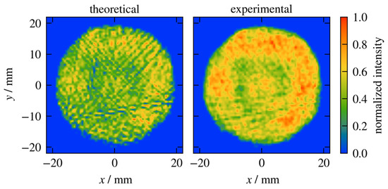 Figure 7 shows a comparison between theoretically and experimentally determined projection matrices using a premixed flat laminar methane-air flame [21] as an example. The theoretical projection matrix was developed based on the geometric arrangement and properties of the optical components using our in-house ray-tracing algorithm [62], which is similar to the method in Reference [21]. Using the theoretical projection matrix, reconstruction artifacts can be clearly identified, which express themselves primarily in linear streak-like structures. They are due to deviations between the nominal position and alignment of the individual optical fibers compared to the actual values. In the reconstruction based on the experimentally determined projection matrix, the artifacts were much less pronounced or disappeared. All species distributions shown in the remainder of the manuscript were calculated using the experimental projection matrix, although the artifacts were much less pronounced for the annular diffusion flames discussed below.
