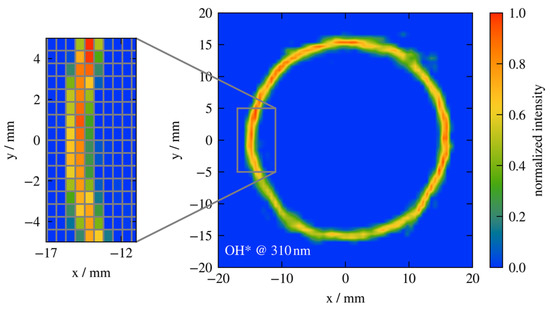 Figure 8 shows a typical reconstruction of the OH* distribution at nm obtained from a laminar methane/air diffusion flame mm above the nozzle exit. In contrast to the previous work [20], we were able to avoid a lift-off of the flame by suitable starting conditions (very low initial flow of methane that was slowly increased to its operational value), so that the flame was almost perfectly circular and fluctuated only slightly at the nozzle exit. The single shot image was taken at an exposure time of 100 ms and the reconstruction was done with the regularization parameters set to and . The compressive-sensing term in Equation (3) effectively eliminated artificial intensities at the flame edge and in the center of the flame. At the same time, the contribution of the Tikhonov term was chosen so that the reconstructed flame front is not measurably broadened. Figure 8 also shows a magnification of the flame front, superimposed with the numerical reconstruction grid. A single grid cell was mm2 in size and the flame front was mapped by about two to three grid cells with high intensity. Since the flame front was much thinner than mm, this resulted in an effective optical resolution in the tomographic measurement plane of about cells or mm, in accordance with the Nyquist-Shannon sampling theorem.