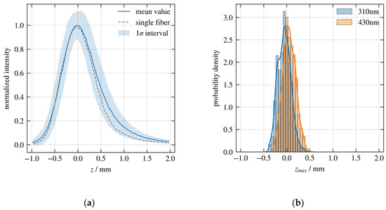 The quality of alignment of the telescopes was experimentally tested by measuring the chemiluminescence signal of OH* (310 nm) and CH* (430 nm) of a premixed flat flame as a function of the vertical position of the burner matrix as described by Anikin et al. [21]. For each optical fiber intensity profiles were measured at several heights above the burner. These profiles, normalized to their respective maximum value, are shown in Figure 9a. The solid line represents the average signal intensity profile obtained for all fibers and both wavelengths, while the gray dashed line is the profile of a single fiber. The shaded area is the -interval of the average profile. Considering that the thickness of the flame front (<200 µm) is much smaller than the width of the profile, the optical resolution perpendicular to the measurement plane approximately equals the full-width-at-half-height (FWHM) of the averaged profile, which is mm. This value is very close to that given in the previous section for the in-plane resolution. Finally, Figure 9b shows the distribution of the position of the maximum intensity () of all individual fiber profiles, separated by wavelengths. There is a small shift of a few tens of microns between the distributions at nm and nm. However, for both wavelengths of fibers have their maximum signal intensity within µm, which is only slightly larger than that obtained in our previous work for the single wavelength POET [21]. Thus, all projections are aligned in the same plane with an accuracy that is significantly below the optical resolution.