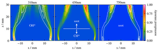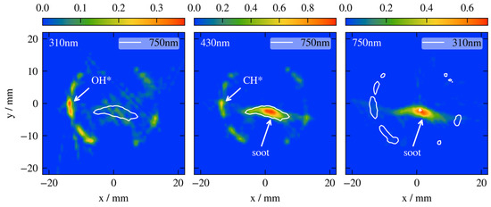 At nm we only detected the thermal radiation of soot particles, whereas at the thermal soot emission was already lower by four orders of magnitude, so that just OH* contributed to the emission signal. In contrast, the soot emission at nm was still intense enough to superimpose the CH* emission. This is exactly what can be observed in the vertical sections in Figure 10 and is illustrated by the iso-contour lines at nm (white solid lines). Directly above the burner exit, there is no soot and the emission at nm stems solely from CH*, which is spatially very well correlated with that of OH* (see left figure). Above mm, soot particles start to appear. Simultaneously, the emission at nm moves inward, into the area of the unburnt fuel, and spatially overlaps with the soot emission. Therefore, the interpretation of the emission at nm must always take into account the possibility of overlapping with the thermal radiation of soot particles. In the case of the laminar diffusion flame shown here, however, the assignment is straight forward.