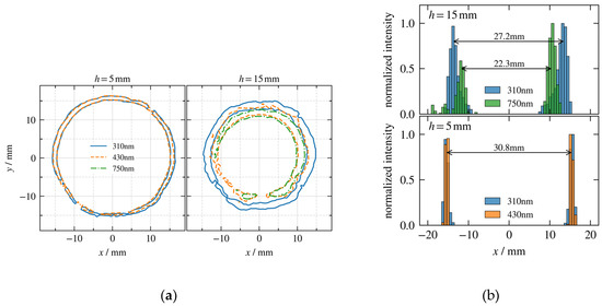 (a) Iso-lines of horizontal cross-sections at h = 5, and h = 15 mm. (b) 1D radial profiles through the center of the horizontal slices.