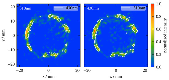 One of the key innovations of the new tomographic setup is the ability to detect multiple wavelengths and thus different species simultaneously. We will first demonstrate the capabilities of multi-wavelength detection on a laminar methane-air diffusion flame. A typical image of a reconstructed intensity distribution at 310 nm and just above the burner opening has already been shown in Figure 8 (see also Video S1). The distribution at 430 nm looks almost identical. The coordinates and are in the tomographic measurement plane, which is oriented parallel to the exit plane of the burner. The z-axis coincides with the vertical burner axis, with z = 0 mm at the burner exit (see Figure 1 and Figure 2). Figure 10 shows time-averaged intensity distributions at 310, 430 and 750 nm in a vertical plane at y = 0 mm. For the vertical sections, images were taken at different heights above the burner. The step size in the z direction was Δz = 0.3 mm. At each position, the reconstructed distributions were averaged over 300 images witch an exposure time of 100 ms each. The apparent broadening of the flame front above z > 10 mm is due to the fluctuation of the flame. In the lower part, however, the flame is stationary.