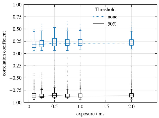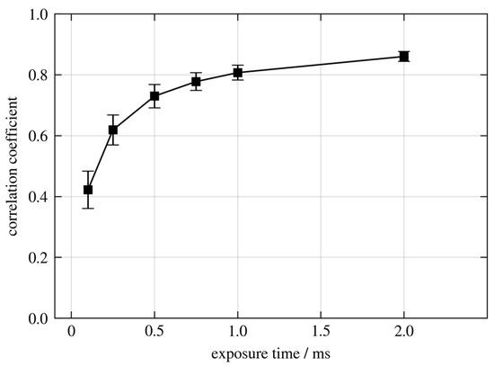 where and are the mean values and and the standard deviations of the two distributions (OH*) and (CH*). The correlation coefficient captures the most important contribution to the structural similarity index (SSIM) [74] that was recently used by Liu et al. in a phantom study [33]. and SSIM are practically identical over the entire range of exposure times and within the standard deviation. The result is shown in Figure 13 as a function of the exposure time in the range of to ms. Each point is the average correlation coefficient of a series of at least simultaneously acquired distributions and the error bars reflect the 1σ-standard deviations. At an exposure time of ms the correlation coefficient was , indicating that the OH* and CH* distributions were very similar. This means that we were very likely to correctly detect the flame structure and that it was not dominated by reconstruction artifacts. The remaining uncertainty was due to reconstruction artifacts caused by measurement noise. If the exposure time was successively reduced, the signal became weaker and weaker until the noise became dominant. Since the noise fluctuations for both species were statistically independent of each other, the correlation disappeared at low exposure times or low signal-to-noise ratios.