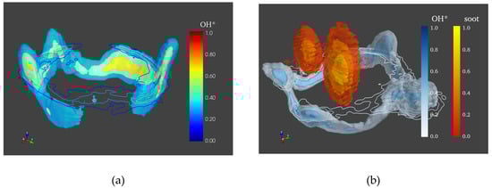 Finally, Figure 16 shows 3D images of time-averaged intensity distributions of OH* or OH* and soot in (a) the non-sooting turbulent methane/air and (b) sooting turbulent ethylene/air diffusion flames, respectively. Experimentally, the measurement plane of the tomographic setup was slowly scanned from the burner exit downstream through the flame. At each point, an image of the flame was taken with an exposure time of 100 ms and the frames were later assembled into a 3D distribution. The general structure is the same as that in the instantaneous 2D distributions (Figure 12 and Figure 14).