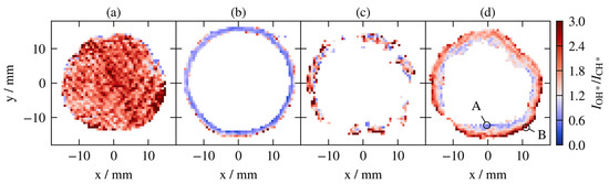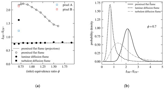 Figure 17a also contains intensity ratios obtained from laminar and turbulent methane/air diffusion flames. For both diffusion flames, the given equivalence ratio represents the fuel-air ratio between the separate inlet flows for methane and air. As expected, the intensity ratio and, thus, the fuel-to-air ratio in the flame front of a laminar diffusion flame (filled circles, , compare Figure 10 and Figure 11) is constant and independent of the global equivalence ratio. The flame always burns at the same fuel-to-air ratio. The horizontal dashed line indicates the mean intensity ratio of the laminar diffusion flame. Consistent with literature data, the intensity ratio under non-premixed conditions is much lower compared to premixed combustion [11,13,27]. In contrast, the median intensity ratio of a turbulent diffusion flame (nominal inlet , ) is between that of the laminar and premixed flames, indicating that under turbulent conditions combustion is more like that of a premixed or partially premixed flame, even though fuel and air are supplied separately [13,27]. In other words, fuel and air are thoroughly mixed in the turbulent flow field.