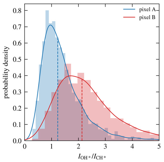 The snapshot of the turbulent flame (Figure 18c) suggests the existence of areas with intensity ratios that are similar to those of non-premixed and premixed combustion. However, when interpreting the resulting intensity ratios, the greater uncertainties in the reconstructed absolute intensities at short exposure times (low signal-to-noise ratio) must be considered. More robust statements can be made using the averaged combustion field in Figure 18d. It shows a radial dependency of the intensity ratio, which suggests a transition from non-premixed to premixed or partially-premixed combustion with increasing distance from the burner axis. We can also analyze the PDF of single pixels or pixel regions over a series of images. This is shown in Figure 19 where we plot the PDFs for pixels with predominant non-premixed (A) or (partially) premixed (B) combustion. The PDFs in both regions are markedly different and shifted against each other. Vertical dashed lines mark the median of the respective distribution. The median values have also been included in Figure 17a (open squares). It is evident that pixel region A is somewhere between non-premixed and premixed combustion, whereas pixel region B is very close to the intensity ratios observed in premixed combustion. Again, the distributions of intensity ratios are quite broad due to reconstruction errors and a quantitative analysis should be carried out with caution. Nevertheless, our tomographic measurements allow qualitative, but spatially resolved, statements about the mean fuel-to-air ratio or the combustion mode, which is sufficient for many industrial, diagnostic applications.