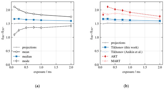 Overall, the median of the reconstructed distributions is a robust statistical measure to characterize the intensity ratio because it is (1) very close to the intensity ratio of the radon projections and (2) almost independent of the exposure time or signal-to-noise ratio. However, this is only true for the Tikhonov regularization used, for example, in this work or by Anikin et al. [20,21], as shown in Figure 20b. The figure also contains median intensity ratios obtained when using the algebraic reconstruction technique (ART) [78,79] or multiplicative algebraic reconstruction technique (MART) [78,79,80,81]. Details on the reconstruction algorithms and an in-depth analysis of their accuracy in the limit of low signal-to-noise ratios can be found in Part II [60]. For ART and MART, the median intensity ratio increases significantly with decreasing exposure time, as shown in Figure 20b. In addition, the average (mean) intensity ratio increases even more than for the Tikhonov regularization. Only for large exposure times (>2 ms) ART and MART will converge towards the values of the Tikhonov regularization and of the radon projections. Thus, a quantitative interpretation of the reconstructed distribution is for ART or MART even more troublesome than for the Tikhonov regularization, especially under conditions with a low signal-to-noise ratio. This emphasizes the indispensable need to characterize the signal-to-noise ratio under the actual experimental conditions in order to be able to reliably assess the quality of the tomographic reconstruction.