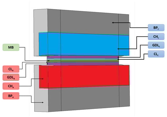3D geometrical view of the model, integrating bipolar plate (BP), channels (CH), gas diffusion layers (GDL), catalyst layers (CL), and membrane (MB).