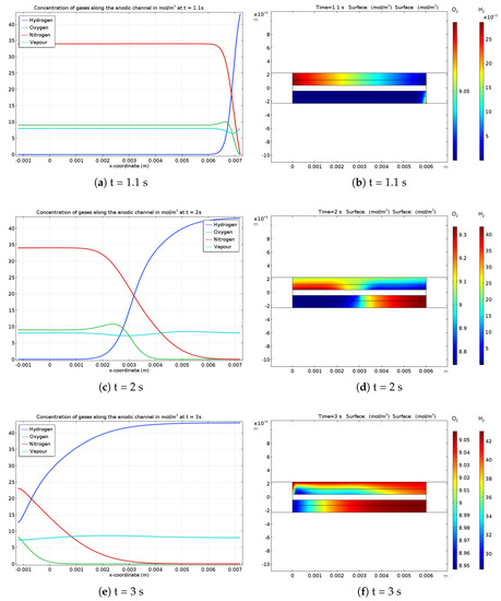 The gas concentrations in the anodic channel and the GDL at different times of a startup are shown in Figure 2. Figure 2a,b present the situation during hydrogen feeding at t = 1 s. In the channel, the concentration profiles are very abrupt close to the hydrogen gas inlet, but gas diffusion effect can be observed on the water vapor and oxygen gas profiles. Whatever the species, the gas concentrations are spreading as the startup is ongoing. For example, Figure 2c,e show that the hydrogen front is smoother than it was close to the inlet at the beginning of the startup. Figure 2d shows the hydrogen front in the GDL located close to the center of the gas channel at t = 2 s. According to the oxygen concentration profile, the electrochemical phenomenon leads to oxygen consumption on the right side of the cathode gas channel while oxygen production occurs on the left side. Moreover, Figure 2f exhibits the gas concentrations re-homogenization in the porous media at the end of the startup. These local gases concentrations at the catalyst layer interface enforce the local electrode potentials at the anode and cathode (Figure 3).