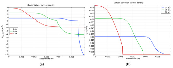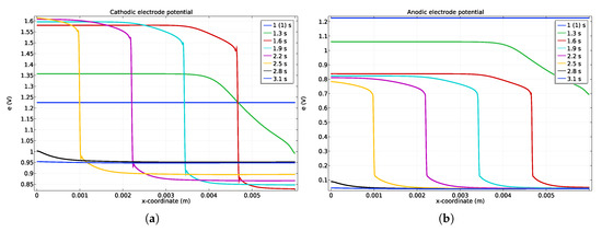During the startup, the potentials of the anode and cathode along the electrode catalyst layer length are shown in Figure 3. A sudden electrode potential drop, moving from the right to the left, is predicted during the startup (see profiles at t = 1.6, 1.9, 2.2 and 2.5 s) because of the hydrogen front displacement. As stated in the introduction and predicted by our simulations, two zones can be distinguished by a sudden electrode cathode potential drop (see Figure 3) due to the low in-plane ionic conduction in the membrane. It can be noted that even if the gas concentration profiles are smoothed, the potential front remains very stiff all along the startup. As the cathode potential ranges from V up to V at the right side (Figure 3), the OER takes place at the left side owing to the cathodic electrode potential being higher than V, while the ORR happens at the right side. At the anode (Figure 3b), the ORR occurs at the left side due to the anodic electrode potential changes from V to V while HOR happens at the right side of the front where the potential is lowered around V.