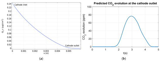 To further validate the model, the CO2 concentration at the cathode channel outlet is calculated (Figure 5b). The simulation predicts a maximal value of 75 ppm in agreement with the 100 ppm measured by Gu et al. [17] in similar conditions.