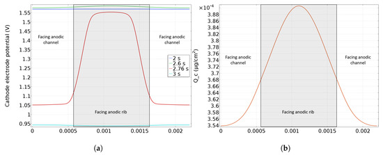 While the previous model presents the degradation along the gas flow, a coupling with the rib/channel model (perpendicular to the gases flow, see [27] for the detailed geometry) is used to investigate carbon corrosion at the rib/channel scale. An effect is expected at this scale, due to hydrogen diffusion in the GDL. Indeed, hydrogen does not arrive at the same time under the rib or under the channel, leading to heterogeneities in carbon corrosion between rib and channel [8,9]. Namely when hydrogen is supplied at the anodic catalyst layer under the channel, same mechanisms as the along the channel are expected to occur. So, hydrogen oxidation and oxygen reduction occurs under the anodic channel while oxygen reduction and water oxidation takes place under the anodic rib. Indeed, because of hydrogen diffusion under the anodic rib, local fuel starvation occurs creating an hydrogen front perpendicular to the one coming along the channel. Simulations have been performed at the cathode inlet (which corresponds to anode outlet) where degradation is the most important. A parallel flow configuration is assumed in channels meaning that hydrogen is supplied simultaneously at each side of the rib. A parameter is defined as the anode rib width to total gas+channel width ratio [27]. It is fixed at by default and corresponds to a anode rib width of 1.1 mm and a gas channel width of 1.1 mm too (see Table 1). As explained in the previous subsection, the cathode electronic potential is modified when hydrogen is fed to the anode inlet and thus the profile predicted by the along the channel model (see Figure 3) is used as input in the rib/channel model. The same coupling is used for the concentrations at the anode channel/GDL boundary. The cathode potential during startup along the rib and channel is then calculated. Figure 6 shows the cathode electrode potential in the plane of the catalyst layer close to the cathode inlet during a startup. In Figure 6, two different zones have to be distinguished: the CCL facing to the anodic rib in the middle (grey color) and the CCL facing to the anodic gas channel on the left and on the right sides. Before the arrival of hydrogen at the anode outlet (at t = 2 s), high and homogeneous cathode potential (over V) is observed (blue curve). When the front arrives at the anode outlet (facing the cathode inlet), hydrogen reaches first the anode catalyst layer in front of the channel (green curve) while its diffusion under the rib is delayed, so a small cathode potential heterogeneity is induced with a higher potential in the area facing the anode rib and a lower potential in the area facing the anode gas channel. This heterogeneity grows as hydrogen fills the anode GDL and a strong heterogeneity is observed at the end of the startup as shown by the red curve (at t = 2.76 s). Indeed, as hydrogen transport is slower under the rib than under the channel, the cathode potential then drops first in the zone facing the anode gas channel until hydrogen diffuses under the rib homogenizing the potential at the cathode. When the anode side is filled by hydrogen, including the area under the rib, the cathode potential drops under 1 V (turquoise curve), which corresponds to nominal operating conditions of the cell after the startup. Indeed, the higher CCL potential under the anodic rib may cause a higher carbon corrosion in this area.