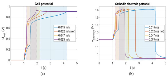 Cell potential (a) and cathode electrode potential (b) at the cathode inlet during a startup for different velocities.