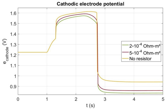 Electrode potential at the cathode inlet during a startup without and with a resistance.