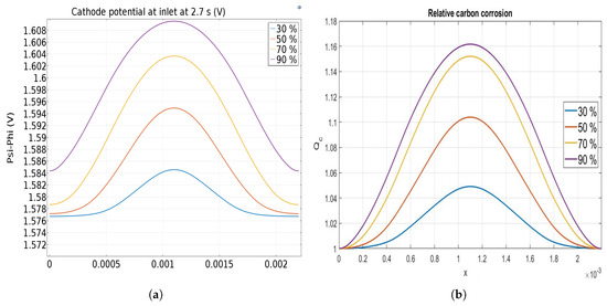 The effect of the anode rib to total width ratio from 30% to 90% is finally investigated. Figure 9a shows the cathode electrode potential at t = 2.7 s at the cathode inlet when it reaches its higher value (see Figure 6). It can be observed that an increase of the anode rib width from 0.6 mm up to 1.8 mm leads to an increase of the cathode potential facing the anodic rib, causing an increase of the carbon corrosion in this area. Furthermore, the cathode electrode potential profile is less homogeneous for the larger anode rib exhibiting the impact of the bipolar plate design. It can be noted that the increase of the cathode potential in the area facing the anodic rib (middle of the image) is not proportional to the increase of the ratio.