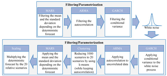 51]. For this purpose, we do not use the absolute forecasting errors, but the forecasting errors related to the forecast. The forecasting error distributions are standardized by removing the offset (expected value) and normalized to the standard deviation of one. This enables us to later roll out the findings gained later on forecast time series for future scenarios. The time series of the forecasting errors are first examined for deterministic components. We have shown that the time series of the forecasting errors have a purely stochastic character and can be modeled using time series analysis methods [