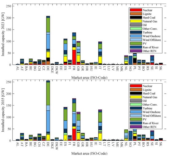 The case study in this paper focuses on the scenario years 2023 and 2035 for the European energy system with consideration of the German coal exit. The assumptions regarding installed power plant capacities in Germany are, in general, based on the German grid development plan 2030, version 2019, scenario B [