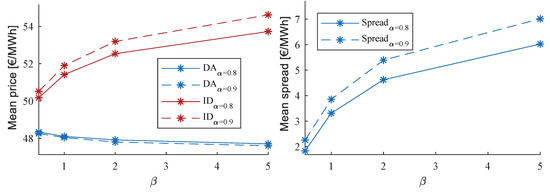 . By shifting the CVaR quantile from 0.8 to 0.9, the ID price increases to 50.52 €/MWh, while at the same time the DA price decreases only marginally to 48.26 €/MWh. Increasing the market participant’s risk aversion by increasing