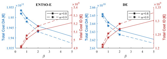 ). However, while the ID costs raise by 7.3/8.5% in ENTSO-E (8.7/9.7% in DE), the DA costs only marginally decrease by 0.6/0.7% in ENTSO-E (1.2/1.4% in DE).