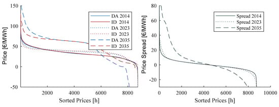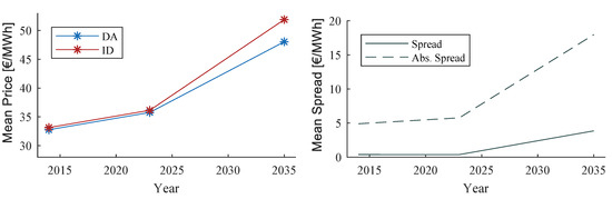 Figure 12 for the German market area. Due to the successive decommissioning of coal-fired power plants, rising commodity- and emission allowances prices and an increasing uncertain feed-in from VRE, both a rising electricity price in general and a widening spread between DA and ID can be observed. The average DA price increases from 32.76 €/MWh (2014) via 34.82 €/MWh (2023) to 47.83 €/MWh (2035). The average ID price, however, increases from 33.14 €/MWh (2014) via 35.27 €/MWh (2023) to 51.84 €/MWh (2035). The ID price fluctuates stochastically around the DA price. Although the spread widens only marginally in the medium term from 0.38 €/MWh (2014) to 0.45 €/MWh (2023), a average positive deviation of 4.02 €/MWh is expected by 2035. In addition, the absolute spread increases according to the model from 4.90 €/MWh (2014) to 5.57 €/MWh (2023) to 17.83 €/MWh (2035). This indicates significant economic opportunities, especially for technologies that benefit from a spread in both directions.
