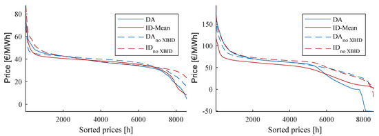 Figure 16). Moreover, the spread between ID and DA without XBID is positive over the entire price duration curve, whereas in the case with XBID the spread becomes negative in a similar magnitude in high-price hours.
