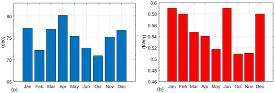 Representative month data are analysed. The demand change follows the increase in travel time in the winter months, but in the summer behaves the other way round. The mean values of energy consumption in January and June is the same and very high, and this accounts for heating in the winter and air-conditioning in the summer, which consume much energy. Figure 2a,b shows the column graphs of the two parameters.