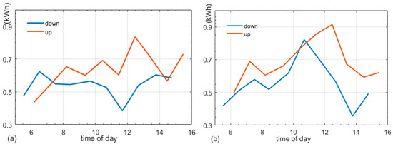 Mean energy consumption for upward and downward bus trips during a day in (a) winter and (b) summer.