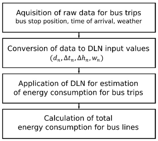 The way of using the model to calculate energy consumption for bus lines is presented in Figure 5. The trained DLN gives estimates of energy consumption for trips between bus stops and requires inputs which are derived from the raw data collected during bus travels.