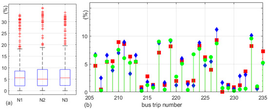 Figure 8b presents an excerpt from the set of calculated errors which covers 30 bus trips out of 600. The N1 markers clearly indicate smaller values of errors, while the N3 markers dominate the tops of the stem plots. Error values are scattered, although most of the values fall below the 10% limit. There are no explicit relations between the N1, N2 and N3 estimation errors.