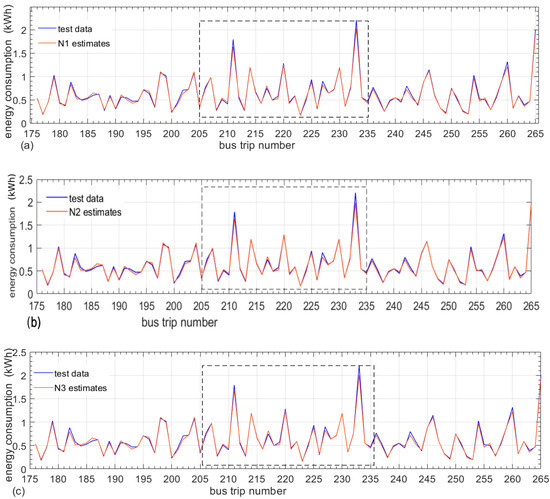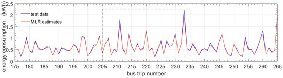 Figure 11 presents the estimation performance, and again, the test data and estimates graphs are paired for comparison. The rectangle covers the range of bus trips which are depicted in Figure 10b. The graphs confirm a mixed performance of the MLR model. The discrepancies between graphs are larger than in the case of the N1 DLN.