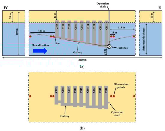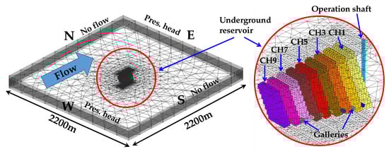- Boundary conditions (BCs): Pumping from and discharge into the underground reservoir are simulated by prescribing the flow at the bottom of the operation shaft (Neuman BC). An internal dynamic Fourier BC, which is head-dependent [35], is implemented to simulate the groundwater exchanges between the underground reservoir (chambers and operation shaft) and the surrounding medium. Regarding the external boundaries, the piezometric head is prescribed (Dirichlet BC) at an elevation with respect the bottom of the model of 121 and 120 m on the upgradient (W) and downgradient (E) sides, respectively. As a result, the underground reservoir is practically flooded (saturated) in natural conditions and groundwater flows from W to E with a hydraulic gradient of 4.6·10−4. The boundary conditions adopted at the external boundaries are maintained constant through the simulations. This fact is a simplification since the piezometric head at the Martelange site oscillates slightly seasonally [46]. However, seasonal oscillations are small enough to not alter the results noticeably. Finally, no-flow BCs are adopted at the top and the bottom of the model and at the N and S boundaries.