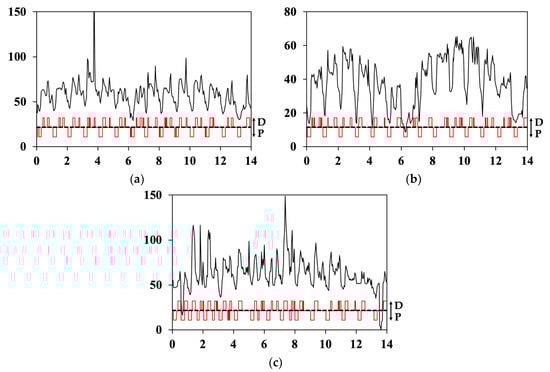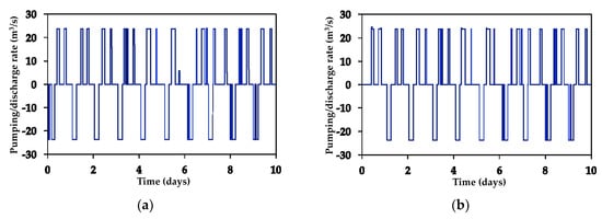 - Frequencies were defined on an hourly basis to maximize economic benefit of the plant operation, i.e., to maximize the balance between electricity cost during pumping and money income when discharging. Every hour, a choice was made between three possibilities (pumping, discharge or no-operation) in order to get at the end of the day 5 h of pumping, then 5 h of discharge and 14 h of no-operation. Pumping, discharge or no-operation hours are not necessary consecutive. For each day, the cheapest 5 h are selected for pumping, and the most expensive 5 h for discharge.