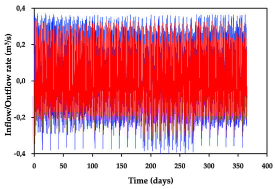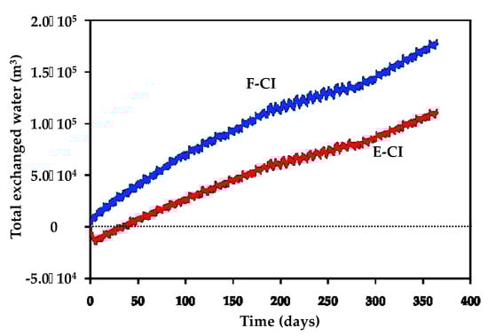 - The underground reservoir is emptied faster than when water exchanges are neglected. In this case, water cannot be pumped despite it is required by the defined pumping–discharge frequency. In the modeled case, this situation only arises at the beginning of the scenario E-CI when an initial pumping is not allowed because the underground reservoir is totally filled. During the rest of the simulations, this situation never arises again since inflows of water from the surrounding medium into the underground reservoir are always higher than outflow.