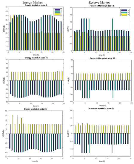 Figure 4 gives the energy prices for Market Models 1, 2, and 3, and the reserve prices for Market Models 1r, 2r, and 3r, in column 1 and column 2, respectively. The LMP at a node may be larger than the largest bid over all the available LSEs in the system. The energy market at node 5 gave a positive value of LMP for all the energy market models. The ECEs at these nodes paid the highest LMP for Market Model 1, a slightly reduced LMP for Market Model 2, and the lowest possible LMP for Market Model 3. The energy market at node 15 and 25 gave a negative value of LMP for Market Models 1 and 2 in the day-ahead market. A negative LMP at a node shows excess generation at that node. The negative LMPs at nodes 15 and 25 became positive in Market Model 3 in most hours. With the reduction in LMP at these nodes, the demand at various other nodes was supplied by these low-levy wind farms, which reduced the total operating cost.