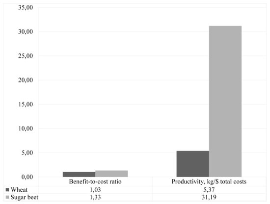 The benefit-to-cost ratio for the sugar beet and wheat production systems was 1.33 and 1.03, respectively (Figure 1).