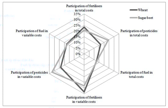 Participation of fertilizer costs in variable and total costs was higher in wheat production comparing to sugar beet production despite the fact that the amount of applied fertilizers was higher in sugar beet production. This is due to the fact that crop protection costs also have a significant share in sugar beet production. This can be explained by the production technology since sugar beet is a very intensive crop as for plant protection measures and fertilizer use. Fuel costs, contrary to the previous two groups of costs had almost equal participation in variable and total costs of both production despite the fact that the amount of fuel used was is almost twice as high in the sugar beet production (comparing to wheat production) due to intensive use of agricultural machinery. As we can see, sugar beet production was characterized by high input use, especially fertilizers, pesticides, and fuel.