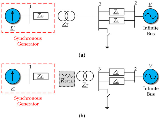 Single machine infinite bus (SMIB) system for theoretical analysis: (a) without superconducting fault current limiter (SFCL) resistance; (b) with SFCL resistance.