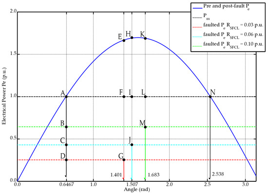 Due to the presence of a three-phase fault in the transformer bus, the admittance between buses 1 and 2 (Y12) is nulled, and the second term of Equation (2) is zero. Consequently, the power-angle equation is dependent only on the real part of Y11, which in turn can no longer be neglected due to the presence of the SFCL resistance. Figure 2 shows the modification of the power-angle curves for different values of SFCL resistance.