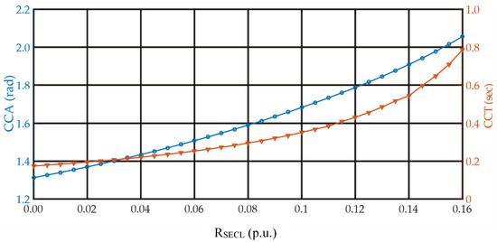 The acceleration areas for CCT in Figure 2 are defined by the areas between points ADGF (for = 0.03 p.u.), ACJI (for = 0.06 p.u.), and ABML (for = 0.10 p.u.). The deceleration areas are defined by the areas between points FEN (for = 0.03 p.u.), IHN (for = 0.06 p.u.), and LKN (for = 0.10 p.u.). In Figure 2, it is possible to observe that, with an increase in the resistance added during the fault, there is a gradual decrease in the acceleration area as the machine shaft acceleration is dampened. The added resistance is responsible for partially absorbing the extra energy injected in the generator shaft during the fault. Consequently, the machine rotor acceleration is dampened, and an increase in the CCA occurs. With the increase in CCA, the system remains in synchronism for a longer time, increasing its stability margin. Figure 3 illustrates this behavior, showing the evolution of CCA for different resistance values (from 0.0 p.u. to 0.16 p.u.).