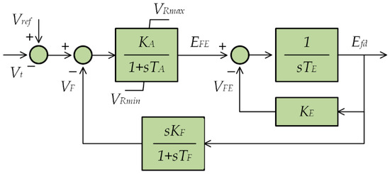 - IEEE Power and Energy Society. IEEE Recommended Practice for Excitation System Models for Power System Stability Studies; IEEE: Piscataway, NJ, USA, 2016. [Google Scholar] [CrossRef]
