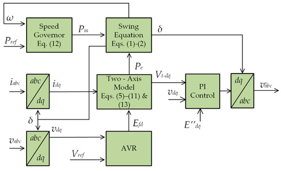 In Figure 5, represents the VSG output phase currents, and represents the VSG output voltages measured after the LCL filter. These measurements are transformed using the Park transformation, with the internal machine angle as the angular reference. The output of the calculated terminal voltages and are fed into a proportional-integral control loop (PI) to adjust the VSG output voltage. A positive feedback is implemented after the PI control loop using the transient voltages . The result is then fed to an inverse Park transformation to generate the converter switching references.