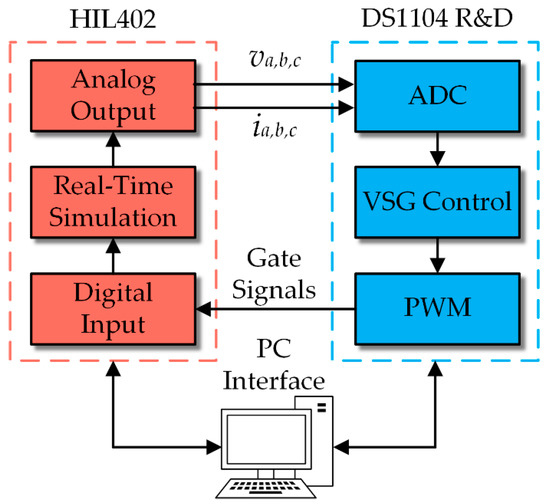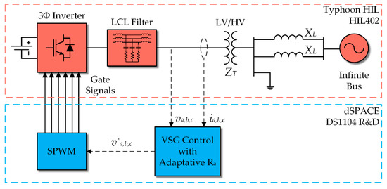 In order to validate the theoretical analysis previously presented, a real-time simulation test-bench is proposed in a HIL environment. This technique involves simulating part of the system in real-time while another part remains an original part of the system. The VSG power electronics converter and the SMIB power system are simulated in real time in the Typhoon HIL environment, while the converter controller is implemented in the dSPACE microcontroller, the same way as in a real application. This type of HIL implementation is usually called control Hardware-in-the-loop (C-HIL) [27]. In this paper, the power system is simulated in real-time by the HIL module, as indicated in the red box in Figure 6. In the meantime, the VSG control strategy, including the proposed adaptation, will be embedded on a micro-controlled platform, indicated by the blue box in Figure 6.