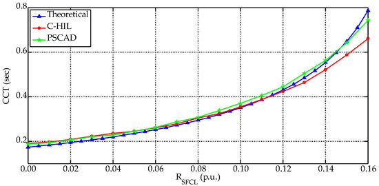 The results revealed an increase in CCT when increasing the virtual resistance added. In particular, it is possible to observe an increase of 470 ms between the CCT for the highest value of , in real time C-HIL and the VSG, without changing the armature resistance in its model. This event represents a 346% increase in CCT and, therefore, in the power system stability margin. So, the results obtained through the real-time C-HIL corroborate the theoretical and PSCAD simulations analysis carried out, showing a consistent increase in the CCT with the increase in . The curves shown in Figure 9 reveal the same shape across the entire range of . A deviation between theoretical and simulated results (C-HIL and PSCAD) is observed, beginning at = 0.10 p.u. This could be explained mainly by the fact that, in the theoretical analysis, a simplified model of the machine is used to numerically determine the critical clearing angle and time. The machine model used in the VSG implementation is a high order model that includes both the swing equation and the machine winding modelling. The lack of fidelity in the model used in the theoretical analysis becomes noticeable when near the system stability boundary. However, the relative errors shown in Table 3 indicate a bounded error along the entire range of values, reaching a maximum of 16% at the limit. Further, the small RMSE calculated confirms the proximity between theoretical, PSCAD simulation and HIL CCT curves. Hence, the present results demonstrate that, although a real SFCL is not present in the system, its virtualized behavior in the VSG causes the contribution to the transient stability enhancement to be included in the system operation.