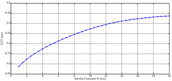 Similar results concerning the increase of CCT could be obtained for an adaptation of the inertia constant. Using the CCT as a figure of merit (FOM), a comparison between both parameter adaptation methods can be presented. Figure 10 shows the theoretical CCT for an inertia constant variation between 1.0 p.u. and 20.0 p.u., while not adding any extra resistance in the VSG armature circuit. The CCA does not change, because the inertia variation does not affect the system power-angle curves. Nonetheless, the change in inertia implicates in the swing equation resolution, leading to slower dynamics and a reduced machine acceleration during a fault, therefore increasing CCT. However, as discussed in the Introduction Section 1, the relation of CCT and inertia has a saturation characteristic, which eventually leads to diminishing returns in CCT with the rise in the inertia constant value. This saturation characteristics is shown in Figure 10, beginning at around = 10.0 p.u. From this point, an increase in inertia leads to diminishing returns in CCT, which leads to a maximum practical CCT between 300 ms and 400 ms. Meanwhile, the maximum theoretical CCT achieved by the proposed resistance adaptive control is 787 ms. Therefore, this result shows an advantage of the control strategy proposed in this paper due to its wider range of CCT.