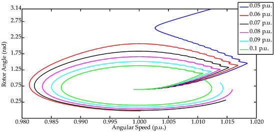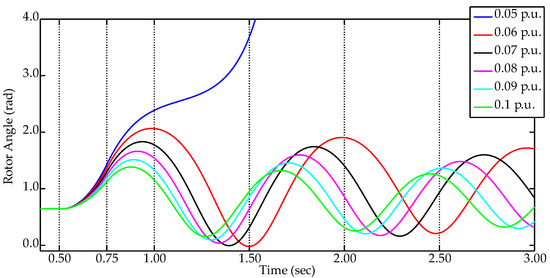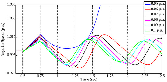 From the curve in Figure 11, it is possible to observe that the higher the resistance added into the VSG model during the fault, the lower the maximum speed reached by the machine at the fault clearing time. The acceleration of the VSG virtual rotor is not as steep in scenarios where adaptive control acts by increasing the resistance parameter. In other words, the extra energy injected into the machine’s rotor in the short-circuit is reduced. This result serves to corroborate the increase in CCT shown in Figure 9, proving the contribution of the proposed control to the system transient stability enhancement. Figure 11 demonstrates the increment of CCA with the increase of found through the EAC. The rotor acceleration is reduced, and the angular displacement is lower at the end of the fault. As a result, the system can reach higher levels of angular separation without hitting the critical energy absorption point. Figure 12 also shows that, for a higher resistance added by the adaptive control, more restrained are the angular oscillations, which is reflected in a dampened active power response after the fault clearance. This drives the system to lower settling times for the post-fault VSG dynamic response. It is worth noting that the base for the angular speed, represented in Figure 11, is defined by the system nominal frequency in radians per second, in this case 376.99 rad/s. The initial value of rotor angle, shown in Figure 12, is related to the initial machine angle for steady state, calculated in Section 2 by the EAC as 0.6467 rad.